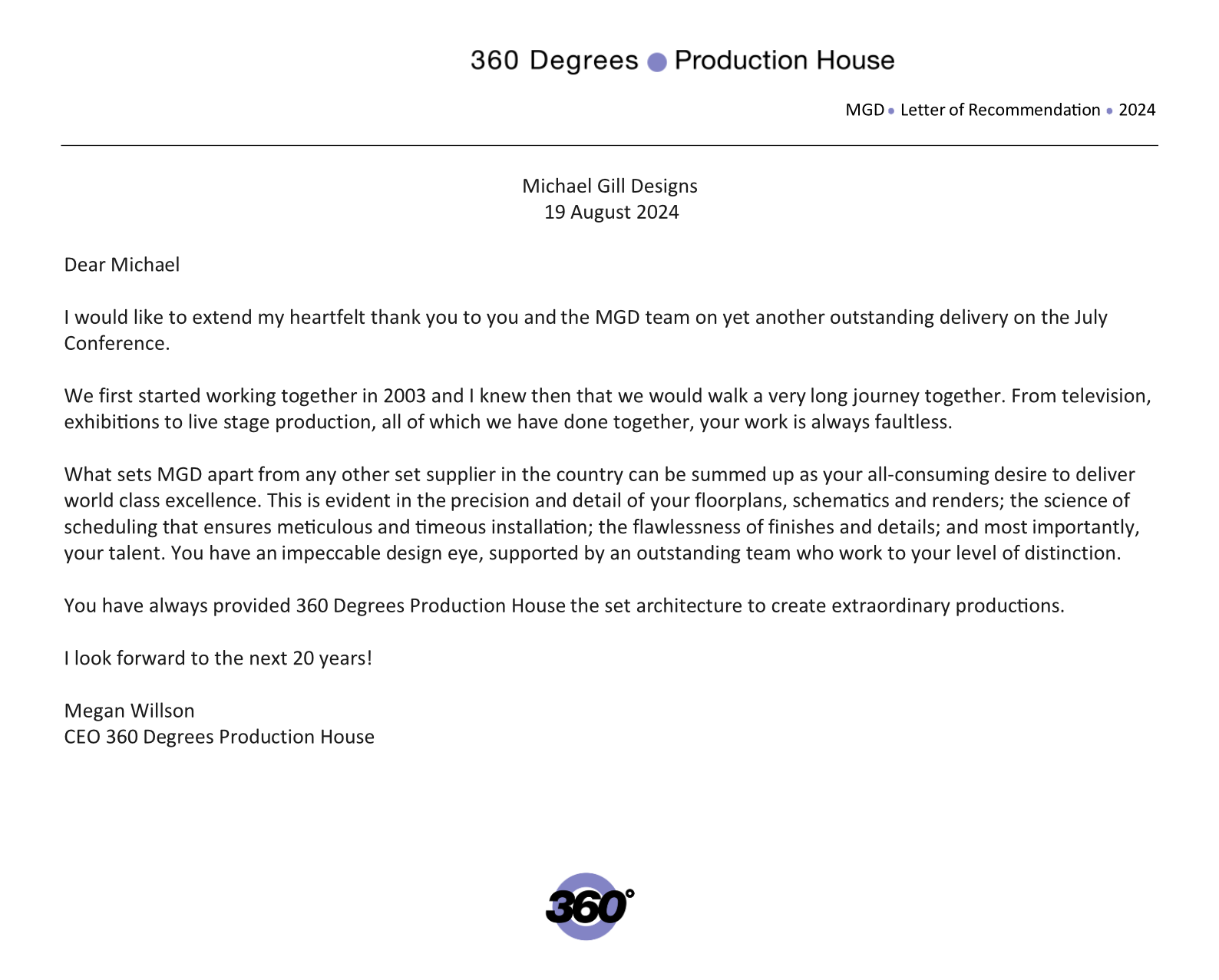 Your partnership has been invaluable to 360 Degrees Production House. The design & desired outcome on this project was phenomenal. It presented some extra ordinary challenges, and I really wanted to express how valuable your dedication & perseverance for excellence, was to our business.